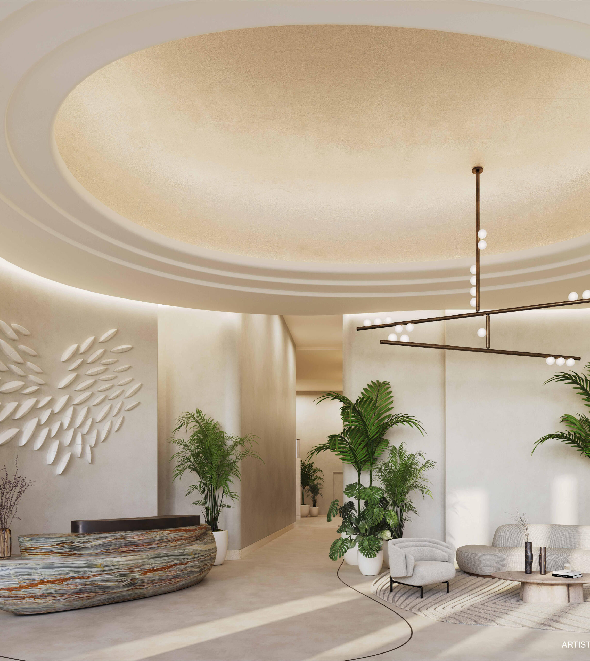 - 24-hour attended lobby with a bespoke reception desk, expansive lounge area with a fireplace, custom sculpted artwork, lighting, intricate wall, ceiling and floor detailing- Grand porte-cochère offering 24-hour valet service appointed with abundant foliage, a sculptural centerpiece, and millwork details.- Private residential only porte-cochère entrance and valet on 2nd level- Resort style pool with cabanas, floating daybeds, and a signature sculpture- Jacuzzi zone with lounge seating and an outdoor tropical shower- Alfresco lounge with lush tropical landscaping, water details, and a variety of seating areas- Sunken lounge seating area surrounded by reflection pools- Summer Kitchen outdoor dining area, providing an oasis for al fresco dining- Indoor Sky Lounge with a feature fireplace, custom stone bar, and intimate seating areas- Glass-enclosed private dining room with a wet bar featuring direct access to the outdoor amenity deck- Game room and entertainment lounge with custom millwork and billiards table, a large-format television, lounge seating, and direct outdoor access- Spirits tasting room with amber glass shelving and bronze decanter racks- Fitness center with a private training/yoga studio and state-of-the-art equipment- Outdoor fitness area with a boxing arena and strength training opportunities- Yoga patio with an adjacent cold plunge pool and landscaped mist garden- Spa suite including a sculptural dry sauna, a steam room, and a pink Himalayan salt room- Private treatment room